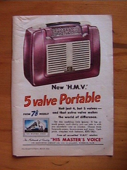 <p></font></h1><center><h3>A great magazine advertisement fro Reader's digest Australia in March 1952. 5.25" x7.5". Slight yellowing on edges, and a tiny nick on bottom left corner which is shown in picture. The advertisement is about a New "H.M.V." 5 valve portable radio. A must have for the collectors who might already have one. I will be sending the ad between two pieces of cardboard to protect from bending and in a plastic slip to protect from the elements.