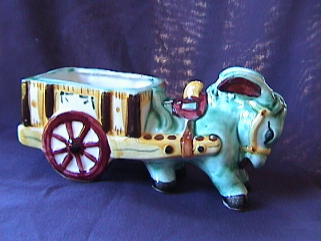 <p></font></h1><center><h3>This great looking Antique Donkey Kart vase is very much sort after these days. This little fellow is pulling along his kart full of flowers, well one day. on the bottom says "JAPAN" In excellent condition with no cracks, chips, or repairs that I can see. 7.25" long x3.5" high.