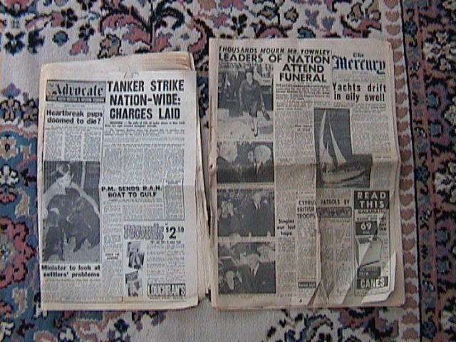 <p></font></h1><center><h3>2 OLD TASMANIAN NEWSPAPERS , "THE MERCURY" - (ESTABLISHED IN 1854) SATURDAY, DECEMBER 28 1963 AND "THE ADVOCATE" - (ESTABLISHED IN 1890) FRIDAY , JULY 12 1968. THERE IS SOME WEAR ON THE SPINES AND DISCOLOURING ON THE PAGES WHICH IS UNDERSTANDABLY AS THEY HAVE BEEN HIDDEN AWAY FOR YEARS.STORIES INCLUDE - MINISTER LOOKS AT A SETTLERS PROBLEMS ON KING ISLAND, BUTTER PRICES DROP, TANKER STRIKE NATION- WIDE CHARGES LAID,TASMANIA WILL GET RABBIT FLEAS, TIME FARMERS DECIDE THEIR FUTURE,CYPRUS PATROLS BY BRITISH TROOPS, YACHTS DRIFT IN OILY SWEEL (SYDNEY TO HOBART YACHT RACE),POLICE ATTEMPTING TO UNRAVEL TRAGEDIES. AND LOTS MORE TASMANIAN STORIES AND ADVERTISEMENTS DEPICTING THE LIFE STYLE OF THE 60'S. For any questions on this great old newspapers and on shipping please email before bidding.
