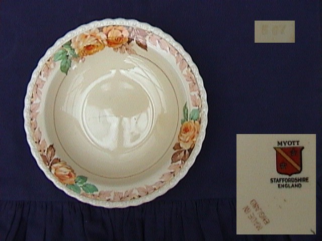 <p></font></h1><center><h3>This very old bowl, has the "Myott" emblem on bottom with "Staffordshire England" and "made in England" "567" and a little squiggle like a "3". There is light rubbing on the flowers and a couple of scratches in the middle. Has a scolloped edge. Cream in color. 8" diameter and 1.5" high. For any questions on this great little collector's piece and on shipping please email before bidding.