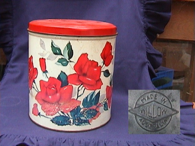 <p></font></h1><center><h3>This is a large red rose willow tin. As shown in photo the "Willow" emblem which is on the bottom of the tin. And as you see in photo the wear it has. With rubbing on the flowers. It does have a tiny dent in the lid which is red.Inside and outside is cream in color. Coming from a canisters set but I only have the one. But you might have the rest or just want the one only. This is a very famous pattern. 8.25" high and 7.75" diameter. For any questions on this great little collector's piece and on shipping please email before bidding.