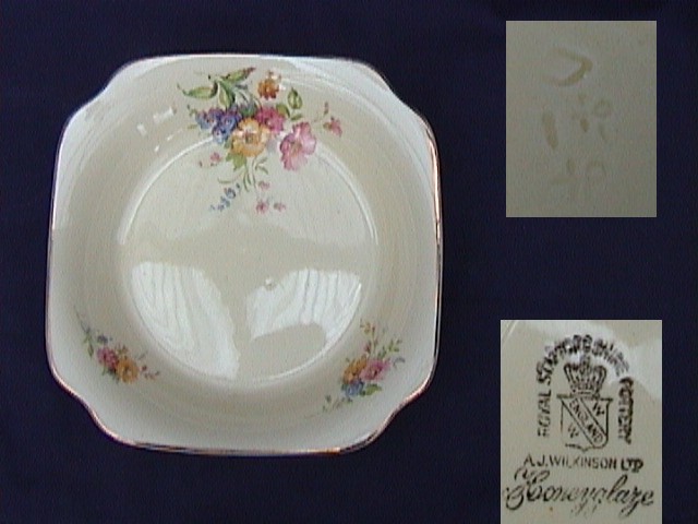 <p></font></h1><center><h3>This lovely shallow bowl from"Royal Staffordshire Pottery" is in lovely condition with no cracks chips or repairs. It has the name "A J Wilkinson Ltd" with the emblem as shown in photo. And a funny squiggle on the bottom of the bowl too, I think it might have been the makers mark. With the pretty flowers on three areas of pink, blue and yellow flowers .This is a sweet bowl. Size 7.5" square and stands 1.25" high. For any questions on this great little collector's piece and on shipping please email before bidding.