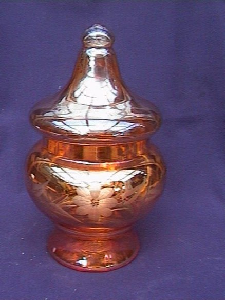 <p></font></h1><center><h3>This lovely Ginger Jar is very pretty with it's Carnival glass look with and etched flower on one side.Have no idea of its age but I know it might be quite old. It does have a couple of very very tiny flea nips it in lid which seems to be quite common with old glass. 8.5" high a very nice piece to add to the collection or just spoil yourself. For any questions on this great little collector's piece and on shipping please email before bidding.