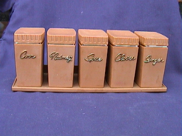 <p></font></h1><center><h3>This spice set comes with its wall holder.Clover, Nutmeg, Spice, Ginger and Cinn. Comes in Caramel in colour with gold writing with a gold rim on lid. No chips or cracks. A great collector piece. The spice canister size is 3.5" high x 2.75" x 1.75" For any questions on this great little collector's piece and on shipping please email before bidding.