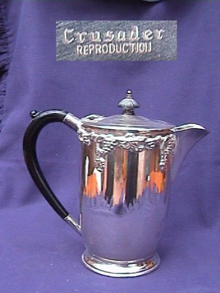 ![]() <center><h1><font color=blue>BEAUTIFUL SILVER COFFEE POT<p>"CRUSADER REPRODUCTION"<p> BAKERLITE HANDLE & KNOB