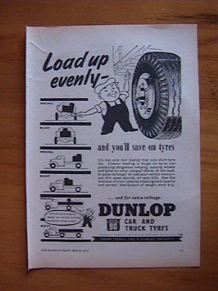 <p></font></h1><center><h3>This great Dunlop advertisement came out of an old 1952 Reader's Digest magazine. Showing you the right way and the wrong way to load up a pickup or ute.5.25" x 7.5" in size. A must have for the Australian Tyres collector For any questions on this great little collector's piece and on shipping please email before bidding.<p>