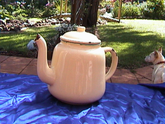 <center><h1><font color=blue>OLD<p>CREAM GRANITEWARE ENAMEL<p>TEAPOT