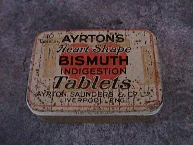 <p></font></h1><center><h3>MADE BY AYRTON SAUNDERS & CO LTD LIVERPOOL ENGLAND. USED TO HOLD 40 TABLETS.USED FOR INTERGESTION. HAS ALL ABOUT THE CONTENTS AND HOW TO USE IT ON THE BOTTOM. A GREAT COLLECTORS PIECE TO ADD TO YOUR COLLECTION. 2.5X 3.25 AND 1" HIGH. IT DOES HAVE WEAR BUT LABLES ON TOP AND BOTTOM ARE CLEAR. For any questions on this great little collector's piece and on shipping please email before bidding.<p>